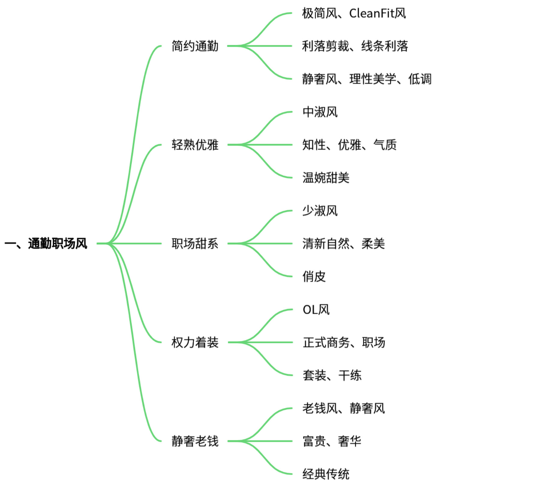 ·简约通勤:融合了极简风与近年大热的CleanFit风,强调利落剪裁、流畅线条与视觉舒适度,体现理性美学与低调的静奢感。