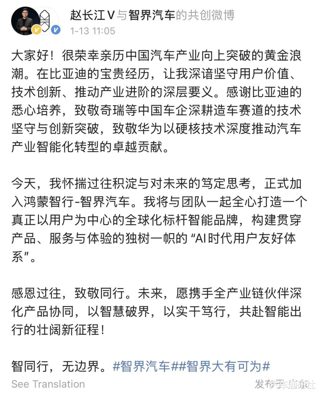 1月13日,赵长江与智界发布共创微博,宣布正式加入鸿蒙智行-智界汽车。