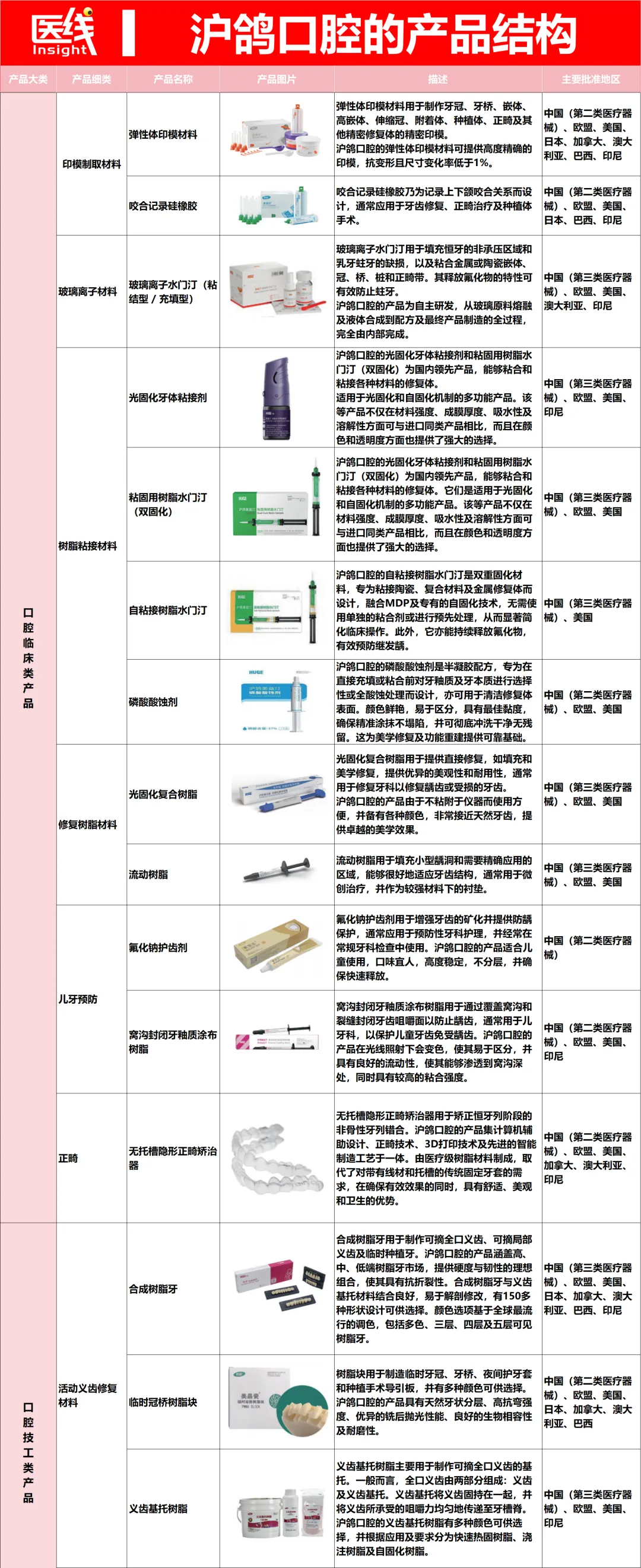 一是口腔临床类产品,包括印模制取材料(弹性体印模材料、咬合记录硅橡胶)、玻璃离子材料、树脂黏接材料(光固化牙体黏接剂、黏固用树脂水门汀)等,直接供牙医在诊所临床使用。