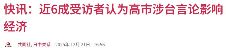 此外,中国的反制行动则是一天比一天犀利,不管是经济文化方面的制裁还是中国人民解放军军事演习。据共同社12月20、21两日实施的全国电话舆论调查显示,关于高市围绕“台湾有事”的国会答辩引发的日中关系恶化对日本经济的影响,包括“倾向于”在内59.9%的受访者表示“会带来负面影响”。据悉,明年1月中国大陆赴日航班中将有2195个班次取消,航班取消率为40.4%。