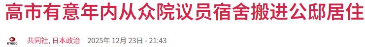 据日本共同社12月23日报道称,日本首相高市早苗日前表示,考虑在年内从东京赤坂的众院议员宿舍搬到位于官邸旁的公邸。她在自己的X(原推特)上发帖称,“危机管理是国家运营的要谛。近期内将离开住惯了的宿舍,搬入公邸。”有首相身边人士透露称,预计在年内工作收官的27日以后实施。高市原本打算尽早搬进公邸,但就任后面临密集的外交和国会审议日程。高市此举正值她11月7日国会答辩称“台湾有事”可能构成“存亡危机事态”引发多方痛批、且连续拒绝撤回或取消之际,也是硬抗中国45天后有意更换居住地。