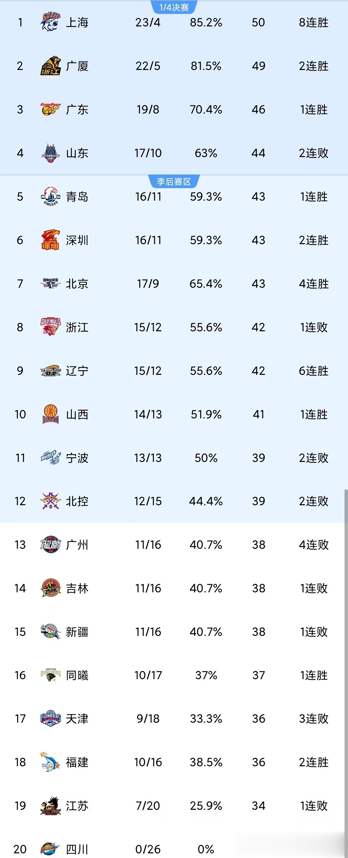 本轮另外两场比赛,青岛102-69大胜江苏,天津84-96不敌深圳。目前上海队23胜4负依旧独自领跑,广厦22胜5负紧随其后,第三名广东已经被拉开差距,第四名山东目前17胜10负也是如坐针毡四强难保。辽宁一波六连胜升到第九,目前也只落后第四名山东两个胜场,从第四至第九名,这六队彼此胜率积分非常接近,可以说乱成一锅粥,每轮赛果都将改写这个区间排名。CBA最新排名更新如下: