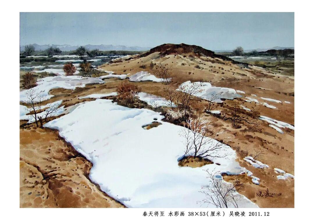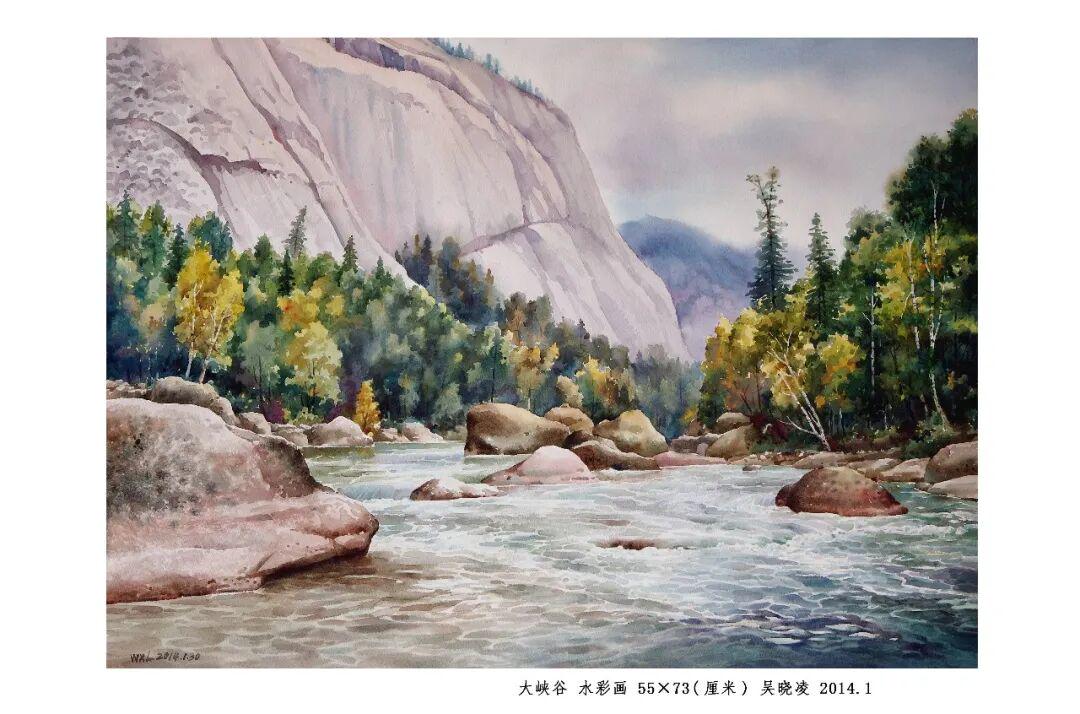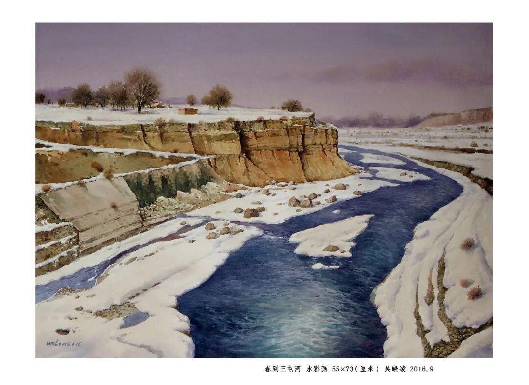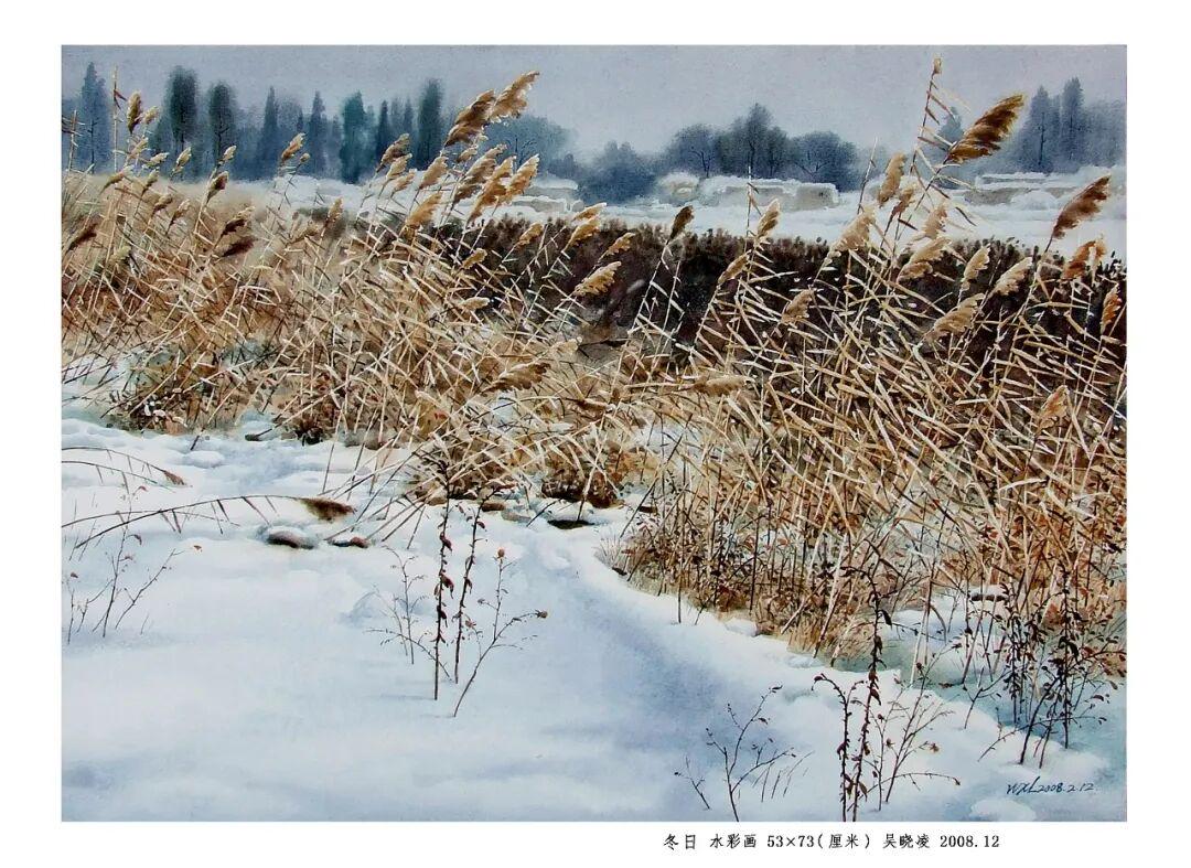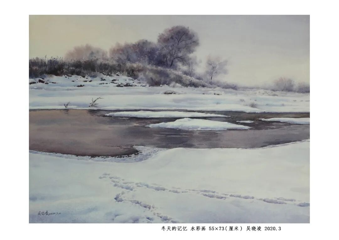 吴晓凌笔下的水彩世界,已然是达到了一种近乎于“空灵”的境地。就像这幅《冬天的记忆》,显得格外通透澄明,毫无浑浊滞涩之气。水色氤氲在简淡中自然生发,浅浅深深地渲染出了天地本真的色调,就连寒风的凛冽、冰水的缓流,也是能通过吴晓凌的笔端静静呈现。整幅画面,在我看来,是美得纯粹,更是美得自然。它无需要刻意隐喻些什么,更不必强行附会情感,只是寻常写生的一隅小景,便足以让观者心神俱净,如临清境。这一点,也正是吴晓凌先生的艺术本色,只关注自然本身的体验,而非炫耀技法。毕竟绘画艺术的生命力,往往都是蕴藏在一颗向自然敞开的朴素心灵中。
