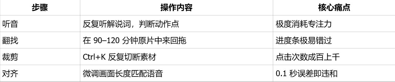 效率瓶颈: 一个成熟剪辑师处理一条10分钟解说视频,手动对位耗时占总时长的60%以上。