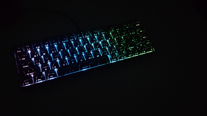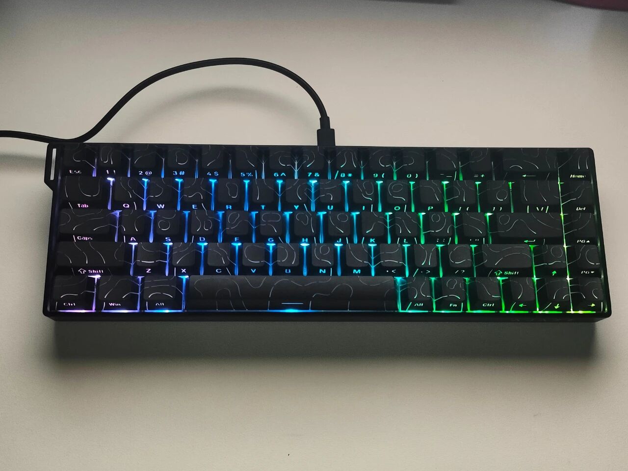 键盘是 68 配列布局,比全尺寸省不少空间,方向键、常用功能键一个没少,切文档不用记复杂组合键,办公游戏切换毫无压力。我选的等高线黑色款,键帽是PBT材质,摸起来细腻不滑手,还不容易沾指纹打油,长时间用下来依旧干干净净。