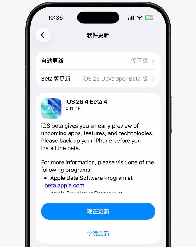 今日凌晨,苹果为开发者预览版用户推送了 iOS 26.4 Beta4 测试版,版本号为:23E5234a。由于本次版本号以字母“a”结尾,这也说明 iOS 26.4 正式版很快就会发布。这次更新主要给我们带来了 2 个新变化,下面我们一起来看看吧~