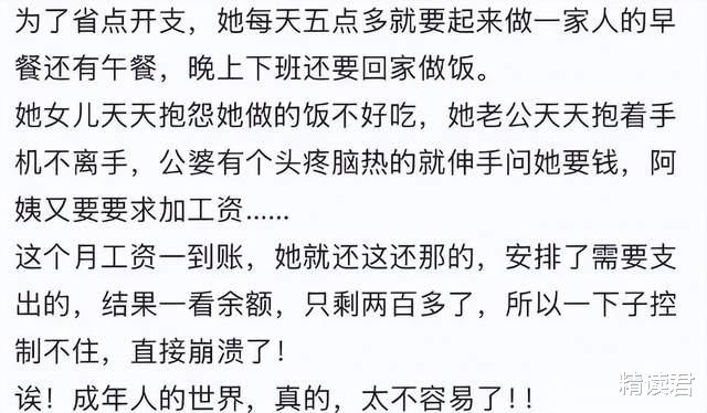 这个月工资一到账,她还这还那,钱像流水一样划走,精打细算下来,只剩两百多,所以一下控制不住,直接崩溃了。
