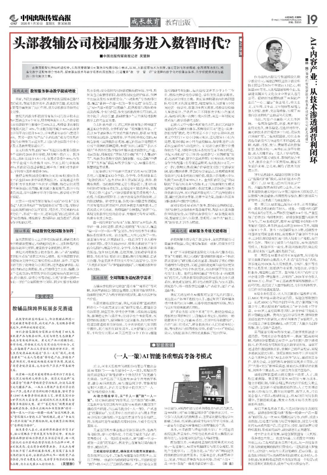 1月30日,中国出版传媒商报刊发题为《头部教辅公司校园服务进入数智时代?》的报道,聚焦教辅行业数智化转型新趋势。文章指出,在教育数智化升级的进程中,头部民营教辅公司聚焦学校教学核心需求,以AI、大数据等技术为支撑,通过定制化系统搭建、全周期落地支持、精准化教学适配等综合性布局,探索服务技术与教学场景的深度融合,打造覆盖“教—学—管—评”全流程的数字化对校服务体系,为学校提供高效智能的一体化解决方案。报道中,世纪金榜AI校园服务系统作为行业典型被重点关注。