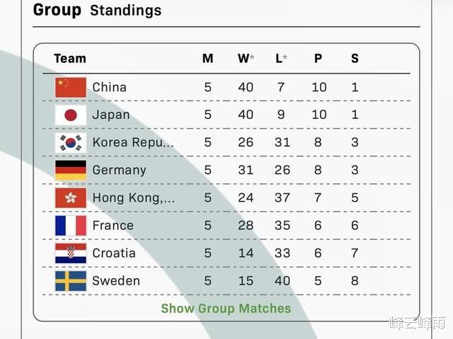 在第二阶段取得3胜2负(积分8分)的韩国队,被日本队(积分10分)超越,从原来的第2位降至第3位。世界最强中国队(积分10分)以5连胜之势领跑。