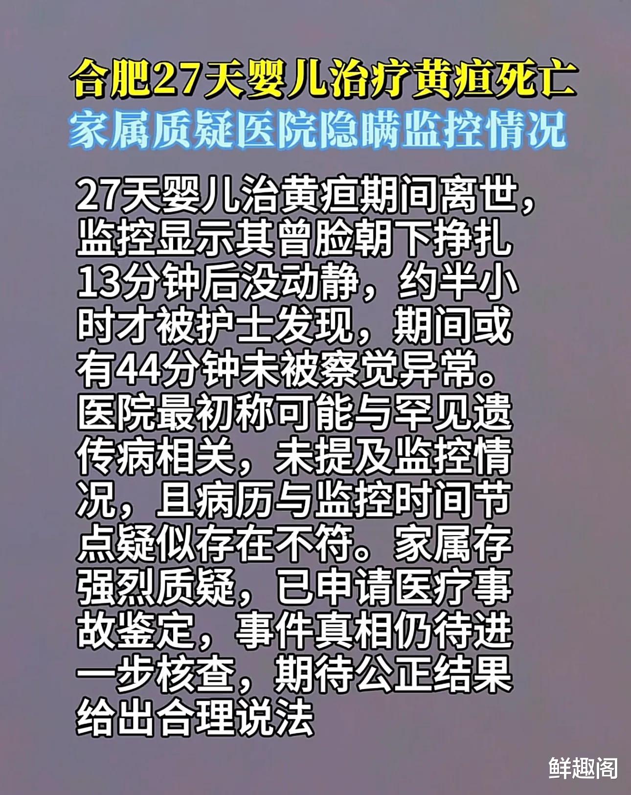 真的太让人心痛和惋惜了,宁波亿婴儿那件事情刚发生不久,便又出现类似的事件。2025年12月23日,有多家媒体都曝光了此事。据了解,这起悲剧发生在安徽省妇女儿童医学中心西院,一名出生只有27天的男婴因为黄疸未退,于2025年11月20日入住该院接受蓝光治疗。
