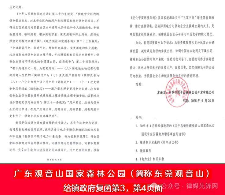对于“非产权人”的说法,记者咨询了广东某律师事务所律师。该律师表示,根据《民法典》的有关规定,东莞观音山公司作为公园承包方,依法享有用益物权,“有权使用公园土地开展经营,且电力设施由其投资建设,完全具备申请增容的主体资格,社区盖章不应成为前置条件”,而供电部门做为独家垄断企业,有法定的义务为所有需用电方服务。