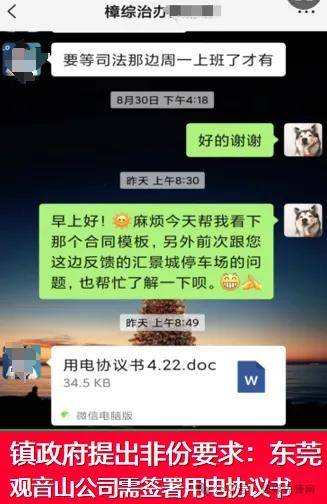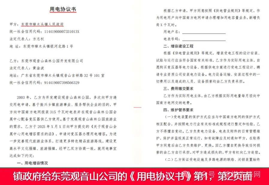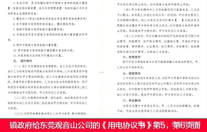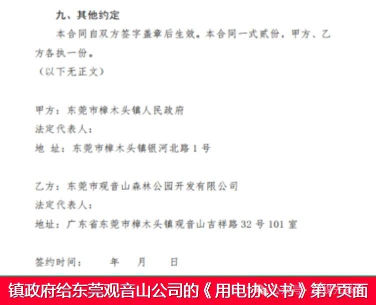 2025年8月,在东莞观音山公司向中央巡视组反映问题后,东莞供电局终于受理了增容申请。但好景不长,樟木头镇政府提出非份要求:东莞观音山公司需与镇政府签署一份供电协议书,其中包含“放弃部分林地使用权”“不得再就高压线问题提异议”等条款,否则增容审批无法推进。而这个荒唐、违法、违规的要求出自樟木头镇政府,就足以证明了东莞官场的违法惯性,理应引起省政府的重视并积极进行彻底的整顿。