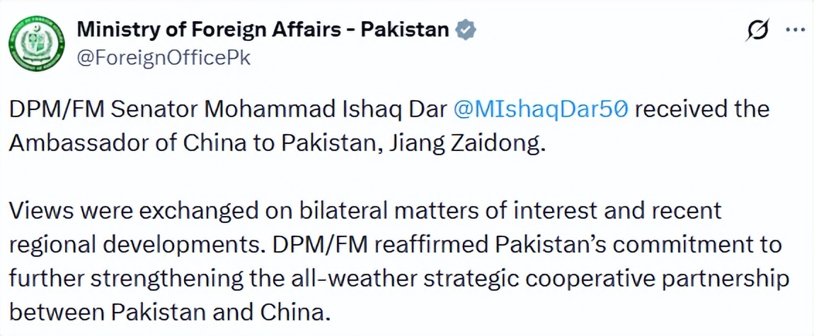 【巴基斯坦外交部发布了与中方接触的消息】