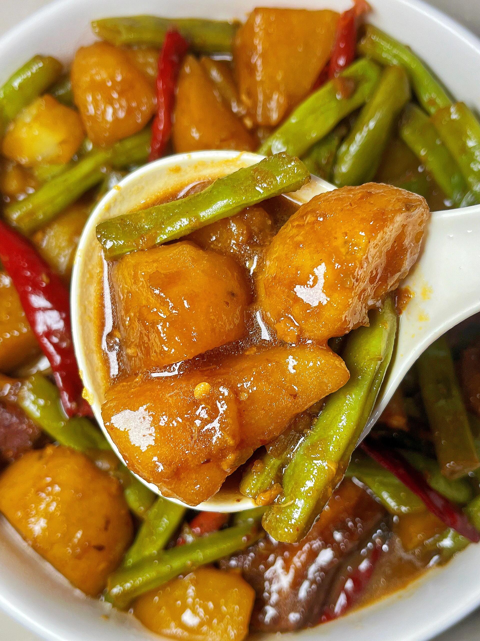 40分钟后,打开锅盖,香味已经飘满厨房了!这时候把豆角掰成段(用手掰比刀切更入味)、土豆块、统统放进去,翻拌均匀,继续炖20分钟。豆角一定要炖熟,用筷子能轻松戳穿土豆,豆角软塌塌的,就说明好了。