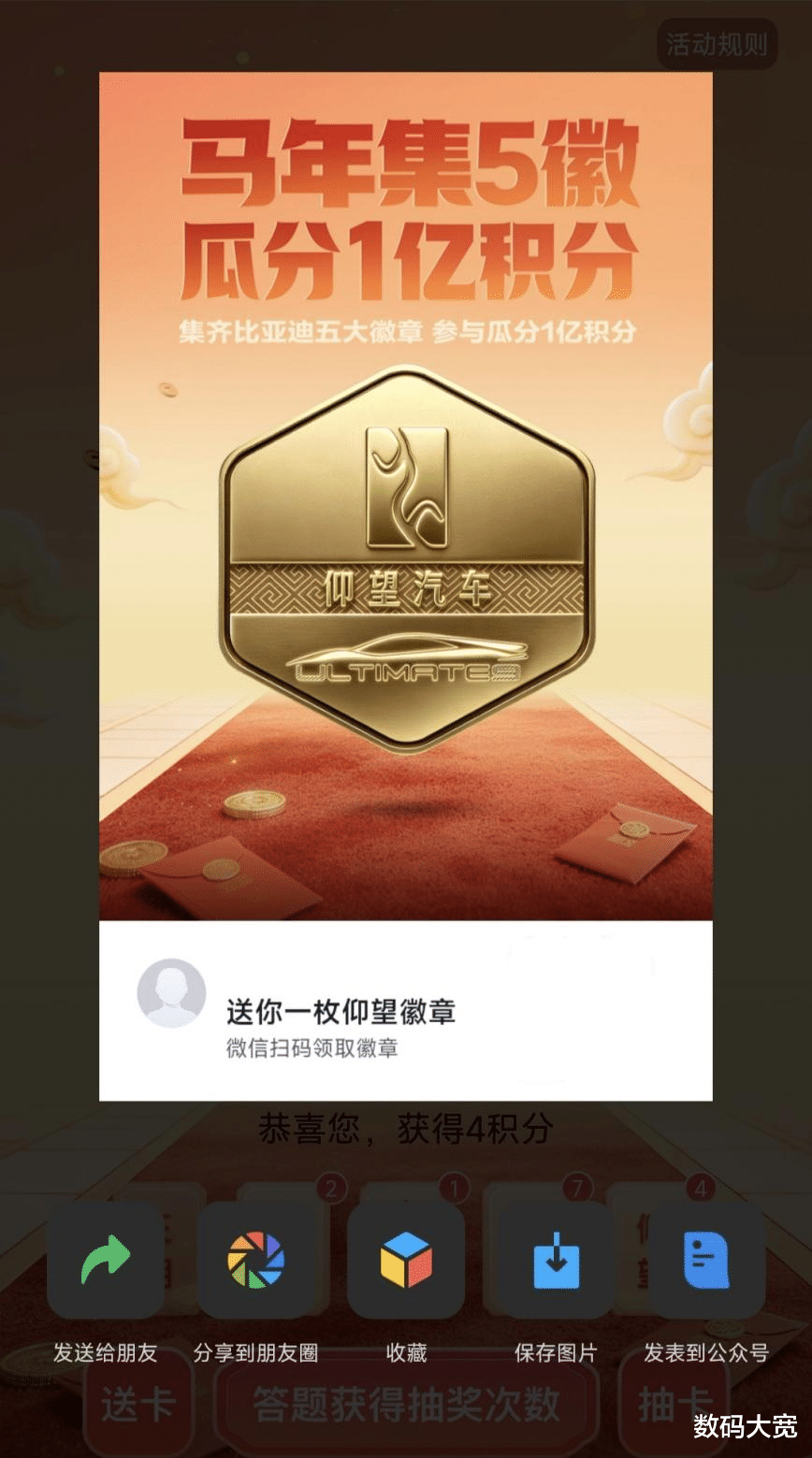活动期间,本品车主首次登录自动获得对应徽章(如:王朝车主自动获得王朝徽章),首次参与直接获得20次抽卡机会(后续每日登录可获得2次),每日完成8道趣味问答可再获得8次抽卡机会、首次分享活动额外获得1次。活动期间最高可获得106次抽卡机会,轻松集徽不费力!趣味问答全是干货,覆盖品牌资讯、硬核技术等,了解比亚迪的朋友更容易获得抽卡机会!