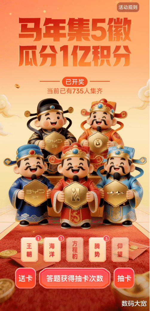 2026马年春节在即,比亚迪宠粉再出新招,马年集徽享好礼。比亚迪APP「马年集5徽 瓜分1亿积分」活动将于2月13日-20日持续开展!作为比亚迪专门为用户和粉丝打造的新春福利,活动主打一个“零门槛”躺玩,不管是不是比亚迪车主,都可以登录比亚迪APP开启集徽之旅。集齐王朝、海洋、方程豹、腾势、仰望五大徽章,合成「比亚迪集团大徽章」,即可参与瓜分1亿积分!