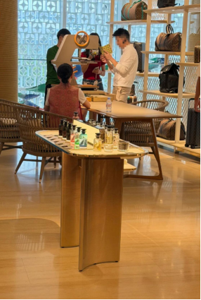除了球场,还有人在包包店偶遇了他们。这次叶一茜也出镜了,一身红衣坐在藤椅上,气质温柔,静静地看着老公和孩子,画面透着一种家常的温馨。