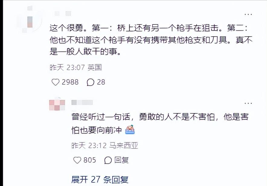 根据新闻所报道,枪手一共有两名,除了英雄夺枪的一个之外,还有一名在桥上,可以想象,英雄完全暴露在桥上枪手的射程范围,随时都有生命危险,他能够顺利夺枪,也是有一些运气成分。