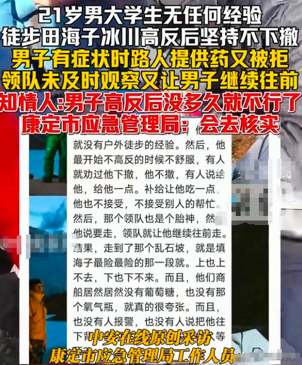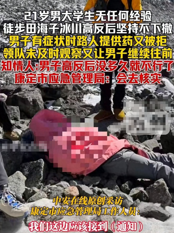 另一位知情人的爆料,更让这场悲剧的 “可避免性” 愈发刺眼:这名 23 岁硕士和同行领队,压根没有任何徒步高海拔地区的经验。出发前,他们连最基础的葡萄糖、氧气瓶都没准备,堪称 “裸奔式” 徒步。其实早在途中,男子就已经感到身体不适,有驴友看出异常,劝他赶紧下山,可他偏偏不听劝;后来还有人主动递上食物,也被他婉拒。