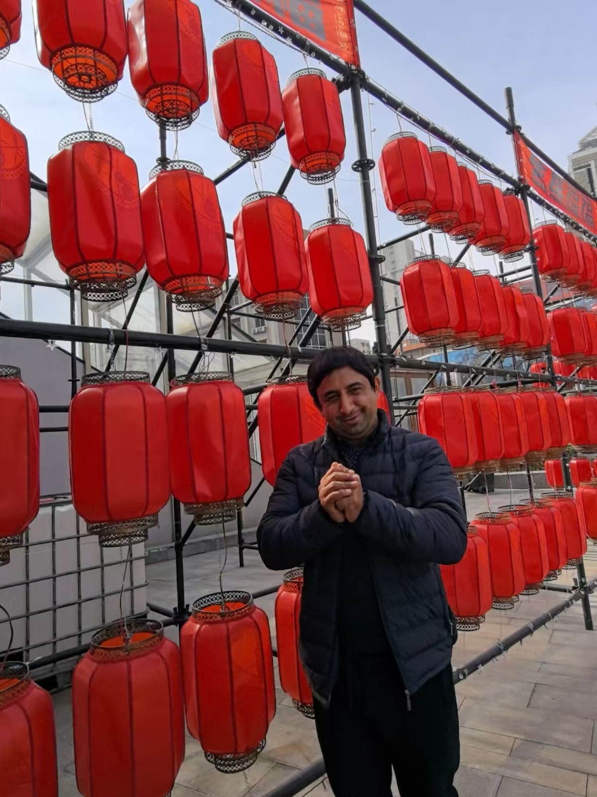 大红灯笼高高挂起,大街小巷洋溢着浓浓的年味儿。大卫站在喜庆的红灯笼旁,用流利的中文为大家送上新春祝福:“祝大家春节快乐!马到成功!马上有钱!”