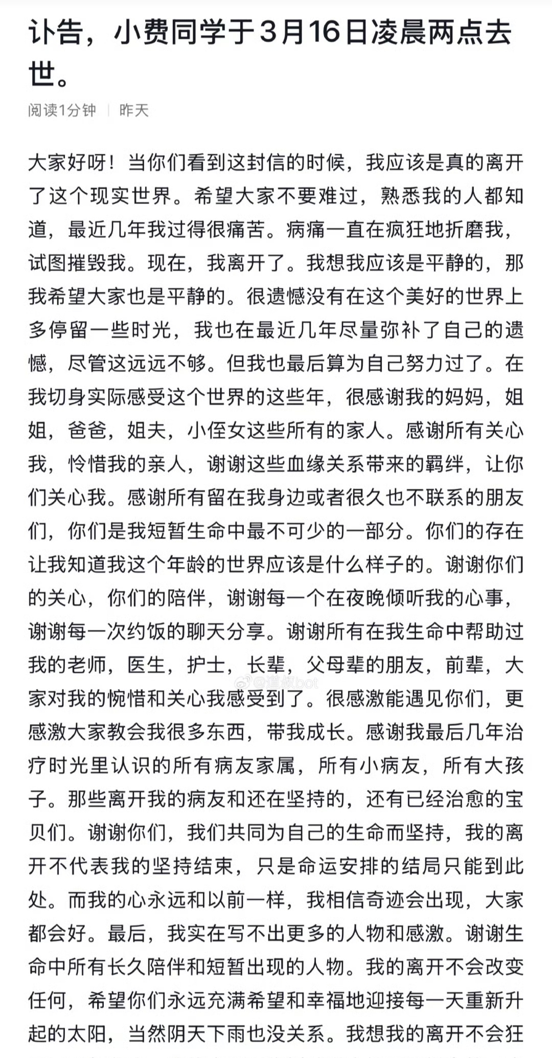 3月16日,小费同学永远离开我们。