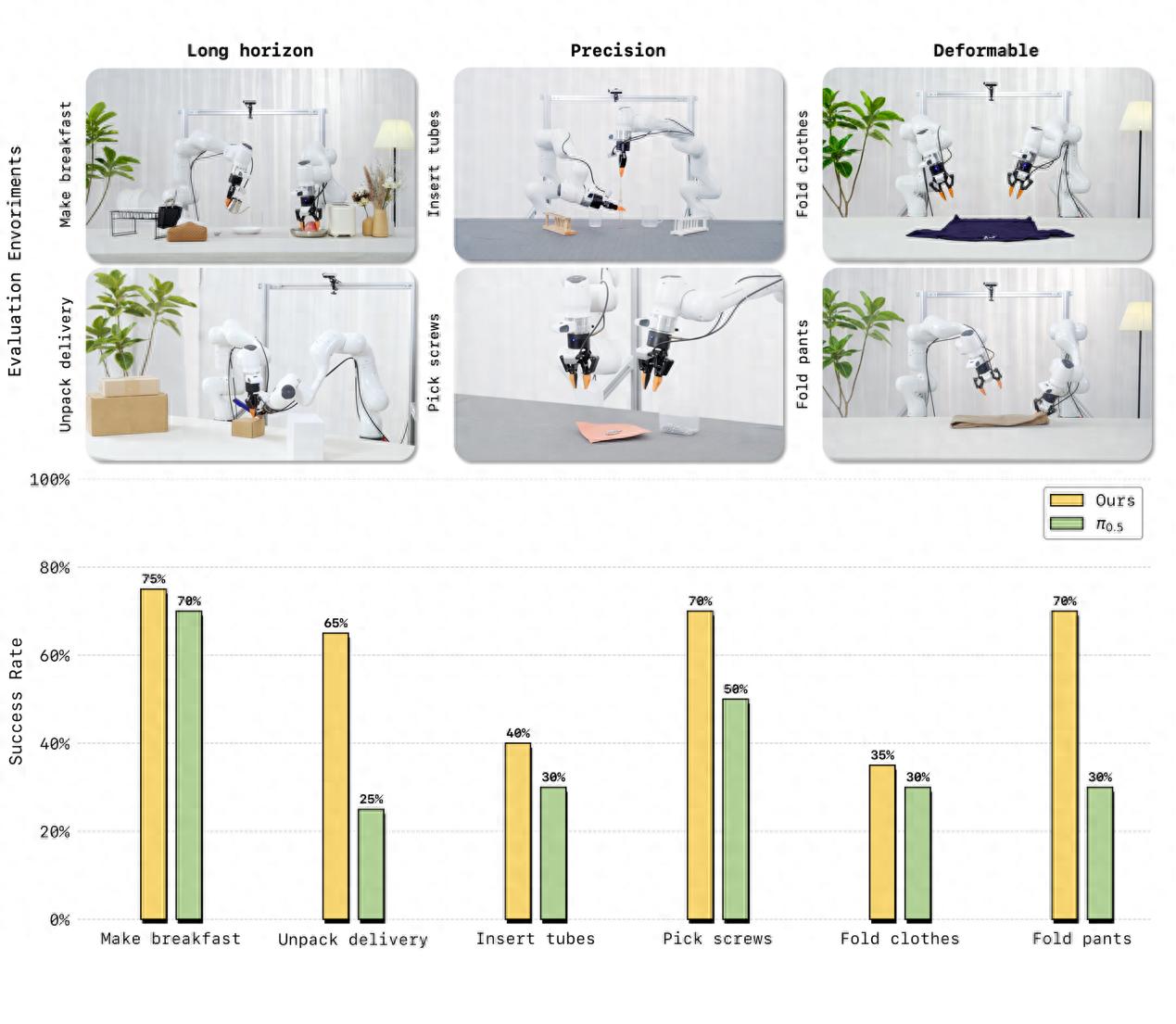 在真机评测中,LingBot-VA展现出对复杂物理交互的强适应能力。面对长时序任务(制作早餐、拾取螺丝)、高精度任务(插入试管、拆快递)以及柔性与关节物体操控(叠衣物、叠裤子)这三大类六项高难度挑战,仅需 30~50 条真机演示数据即可完成适配,且任务成功率相较业界强基线 Pi0.5 平均提升20%。