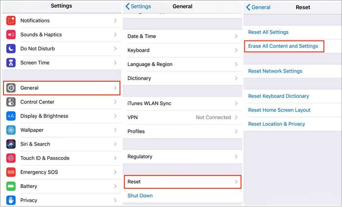 步骤1.在新iPhone上,转到“设置”>“常规”>“重置”>“删除所有内容和设置”。