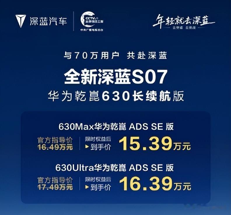 深蓝S07华为乾崑630长续航版近日正式推出,包含Max与Ultra两款配置。官方指导价16.49万元至17.49万元,限时权益后价格为15.39万元至16.39万元。新车搭载77.94kWh磷酸铁锂电池,CLTC纯电续航达630公里,全系标配华为乾崑ADS SE辅助驾驶系统,将用户从复杂的参数对比中解放出来,回归用车本质。