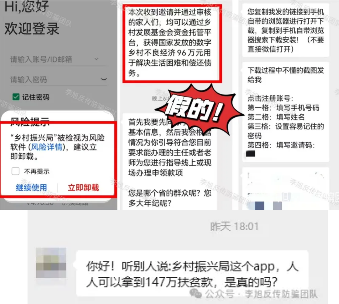 不法分子冒充“乡村振兴局”,以发放“96万数字乡村不良经济款”为诱饵,诱导用户下载并实名注册,目的就是套取个人信息。