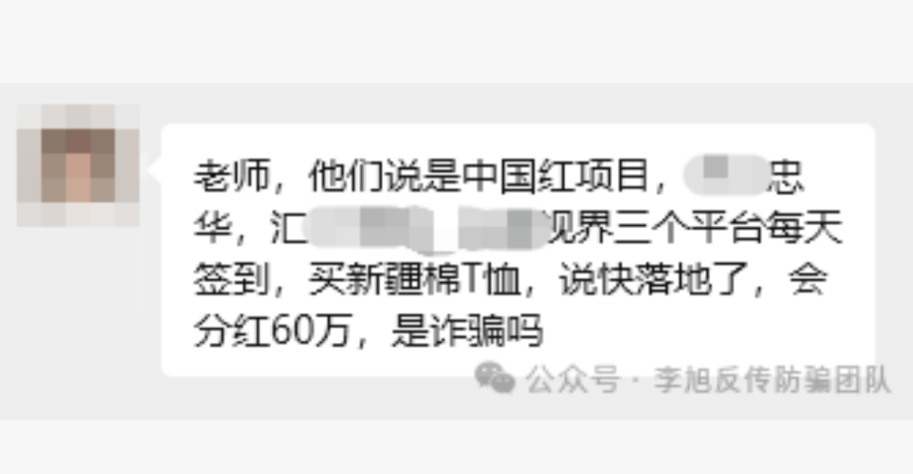 例如“中国红413扫码走通道项目”,宣称不用投资,只要提供个人信息,每日扫码签到、下载指定App,就可获得“福雨”。可实际上,却打着“支持国货”名义,诱导参与者在“与诈骗团伙勾结·不知名·频繁换名”的某电商平台大量消费,实施变相敛财。