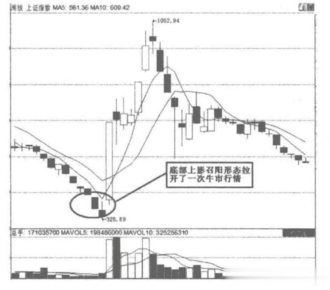 实际上,上影召阳形态在反弹行情中也会出现,也就是说,出现上影召阳形态,未必就是探明大底然后会有大幅攀升。例如,1993年9月下旬,上证指数形成上影召阳之后,从864点反弹至两周后的932点,升幅仅为7.8%。但是,出现上影召阳形态之后,会走出扬升行情拉出周阳线,这一点是明确的。