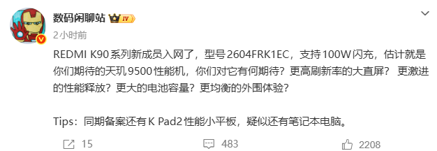 就在刚刚,知名博主@数码闲聊站 发文称:“REDMI K90系列新成员入网了,型号2604FRK1EC,支持100W闪充,估计就是你们期待的天玑9500性能机,你们对它有何期待?更高刷新率的大直屏? 更激进的性能释放?更大的电池容量?更均衡的外围体验”,而该机型便是米粉游戏党们期待已久的红米K90至尊版!