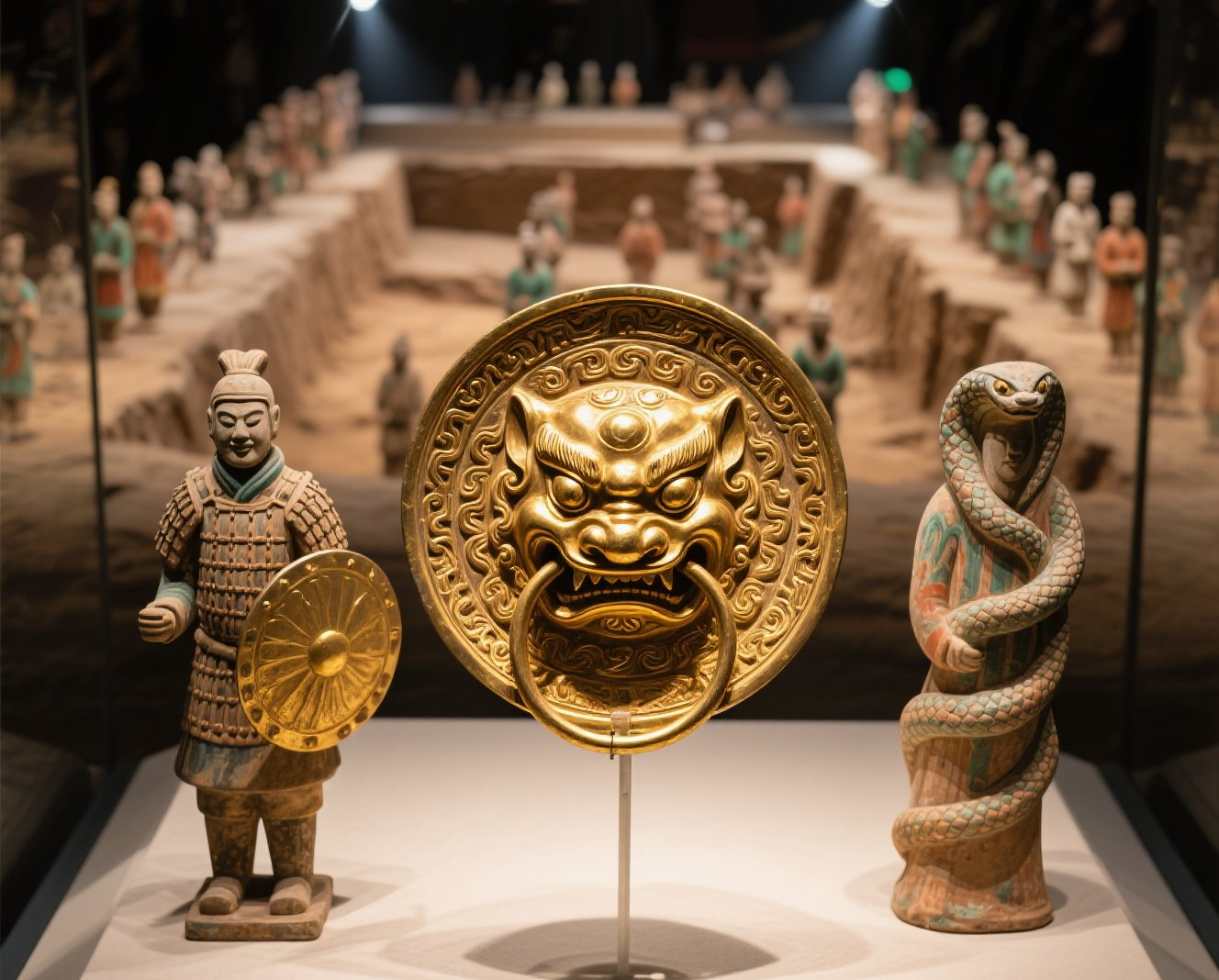 在扬州曹庄隋炀帝墓的考古现场,一件鎏金铜铺首引发专家热议。这件直径26厘米的兽面衔环,与唐大明宫遗址出土器物如出一辙,印证了《资治通鉴》中“炀帝仿长安、洛阳规制营建江都宫”的记载。墓中出土的100余件彩绘陶俑,执盾武士俑的铠甲纹路、双人首蛇身俑的诡谲造型,无不彰显着这位帝王对“千秋功业”的执念。