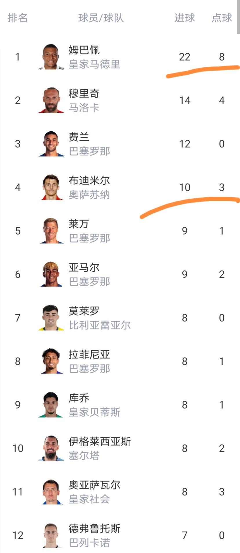 射手榜有4名球员进球达到了两位数,不过姆巴佩真是太强了,一枝独秀,高处不胜寒啊。