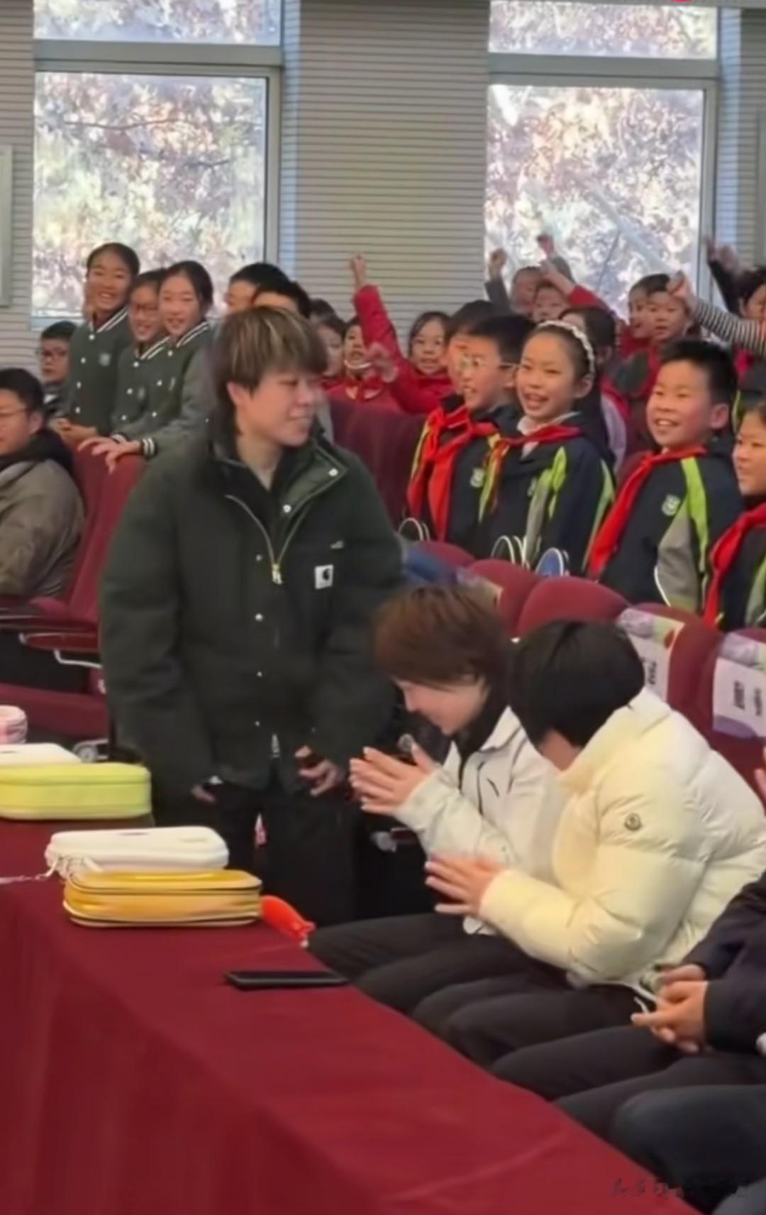 明天就是乒超总决赛的女团半决赛了,看到参加女团半决赛的运动员也都陆续抵达南京了。今天覃予萱、蒯曼、王艺迪、钱天一和杨屹韵一起去一所小学参加校园行活动了,这是女团四强的每个团队都去了一个人吧。当老师介绍王艺迪的时候,大迪站起来跟小朋友们打招呼,这时孩子们一起喊起了口号,把蒯曼和覃予萱逗笑了。