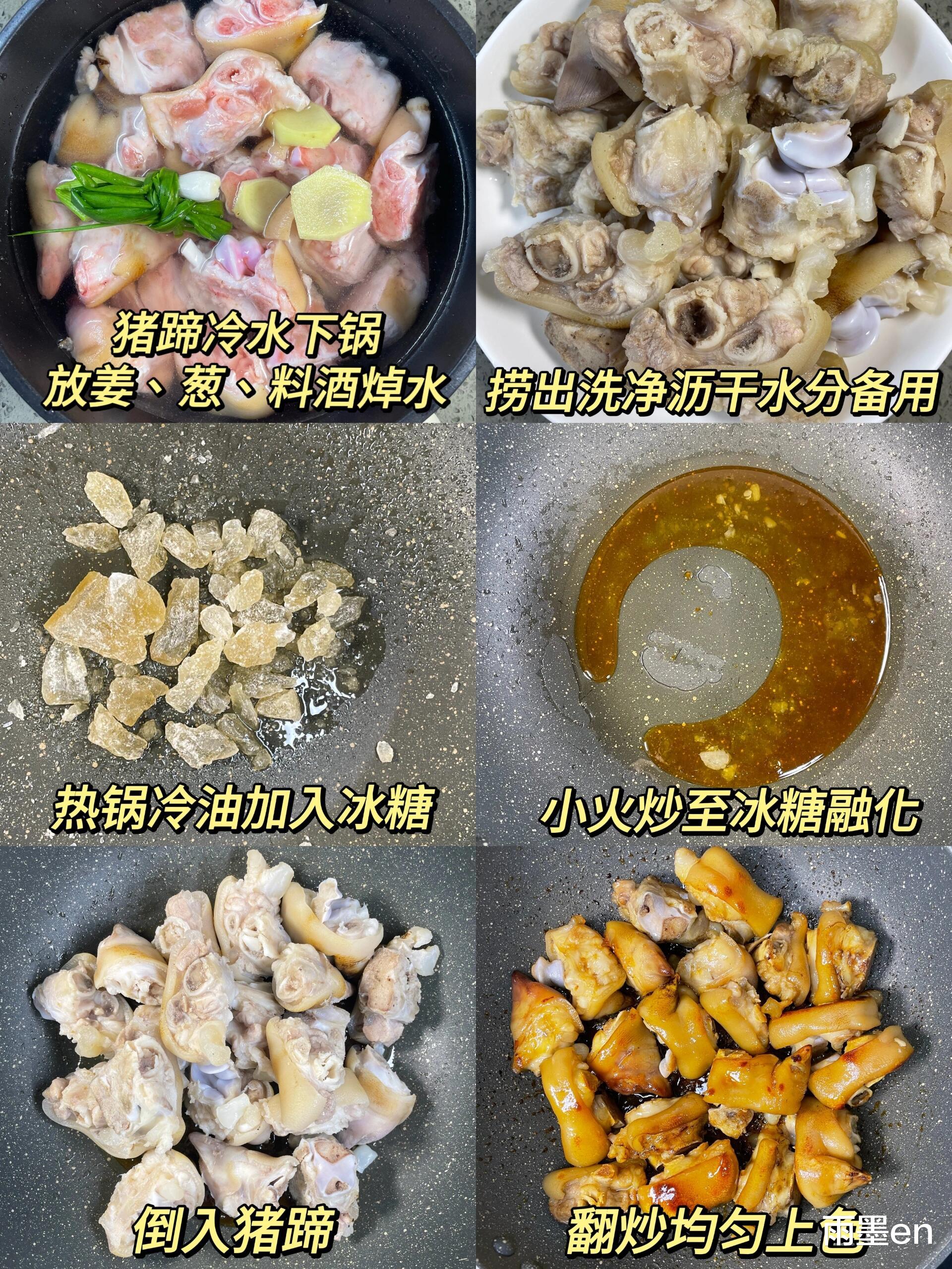 第二步炒糖色是灵魂!锅中放少许油,小火放入冰糖,慢慢翻炒至冰糖融化变成枣红色,并且冒出细密的小泡,立刻倒入猪蹄翻炒,让每块猪蹄都均匀裹上糖色,这一步要快,不然糖色炒糊会发苦哦。