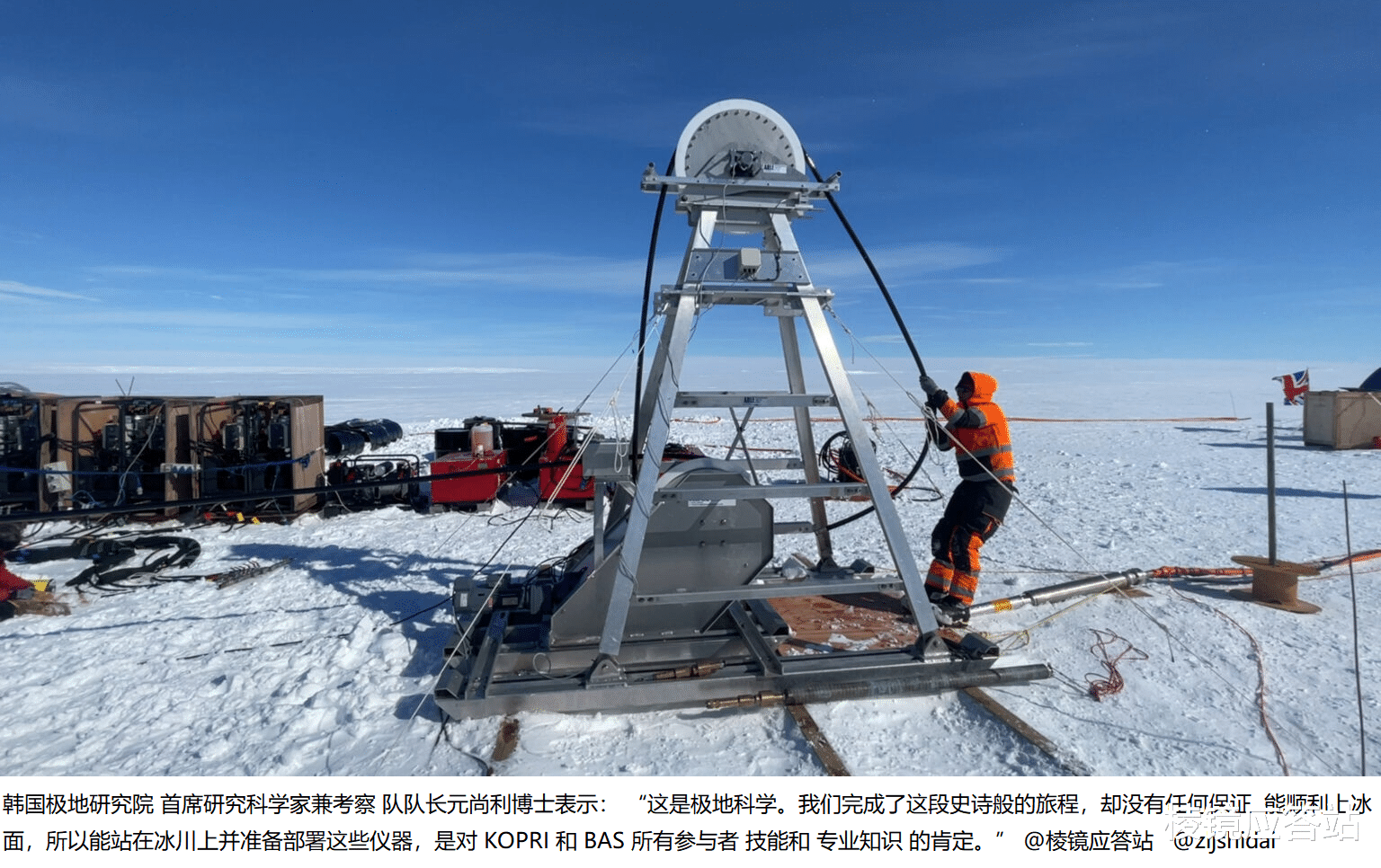 整套装置有一系列软管、加热器、水箱和汽油发电机,由10个人组成的团队轮流操作,在零下好几十度的极地环境里日夜不停地工作。
