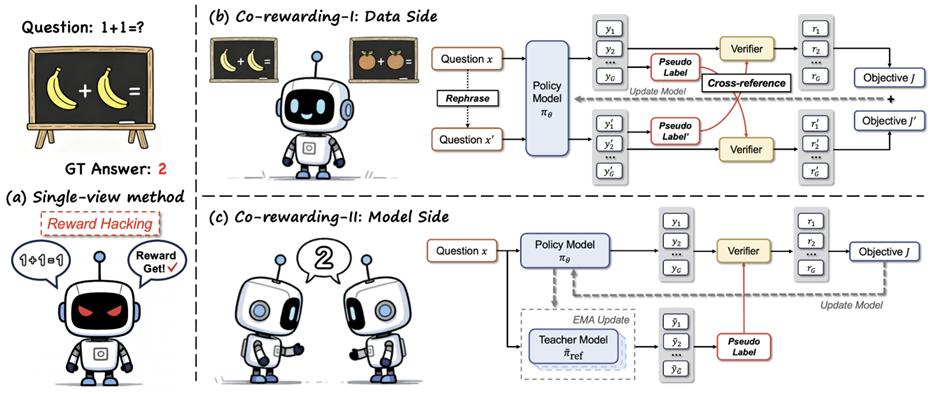 图 2:Co-rewarding 框架示意图。不同于单视角自我监督的方法,(a) Co-rewarding 引入其他视角互补的监督信号;(b) 从数据视角,Co-rewarding-I 使用原题和改写题进行相互监督;(c) 从模型视角,Co-rewarding-II 使用一个教师参考模型产生伪标签监督当前模型。