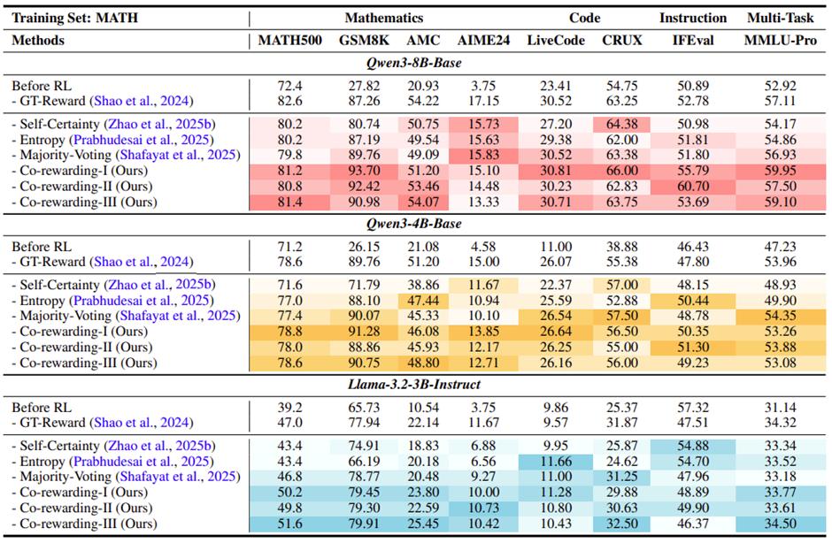 表 2:在 DAPO-14K 训练集上的性能对比,颜色越深表示相同组内性能越好。Co-rewarding-II 相比于最好的自我奖励基线方法在 4 个数学相关的基准上的平均提升达到 + 12.90%