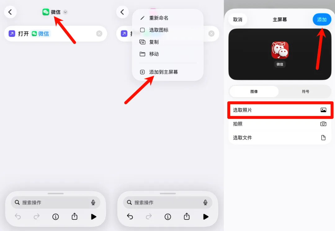 最后通过「选取照片」,从刚刚保存的图标素材中任意选择一款,就大功告成啦~