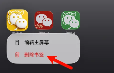 想要移除「新皮肤」,只需要长按图标,选择「删除书签」即可。