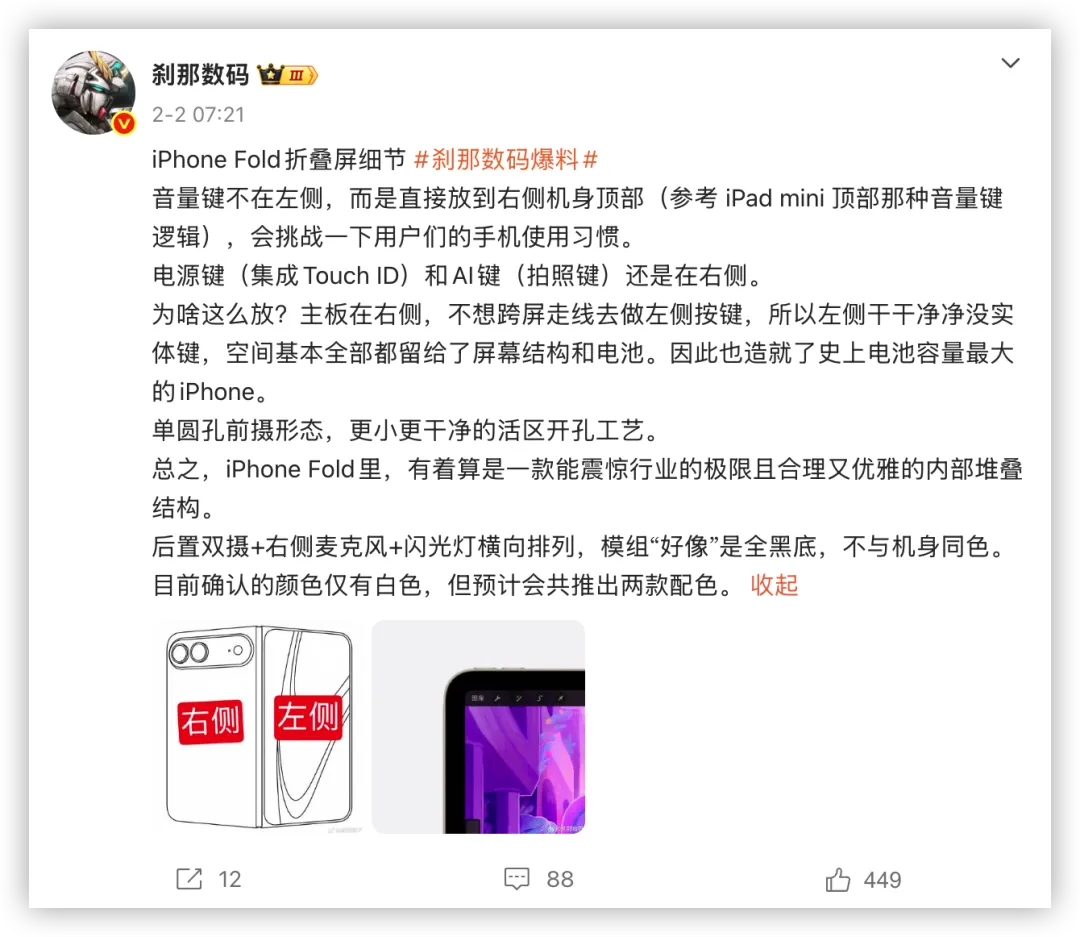 近期,科技博主 @刹那数码送上了折叠屏 iPhone 的更多设计细节爆料。