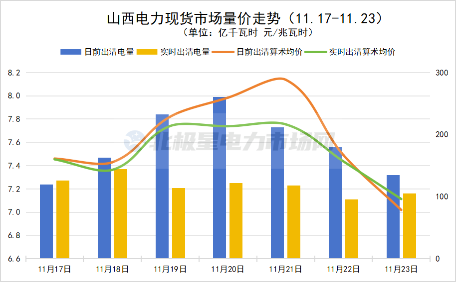 山西:11月17日至11月23日日前出清算术均价最高为288.4元/兆瓦时,最低为78.59元/兆瓦时;实时出清算术均价最高为216.58元/兆瓦时,最低为96.22元/兆瓦时。