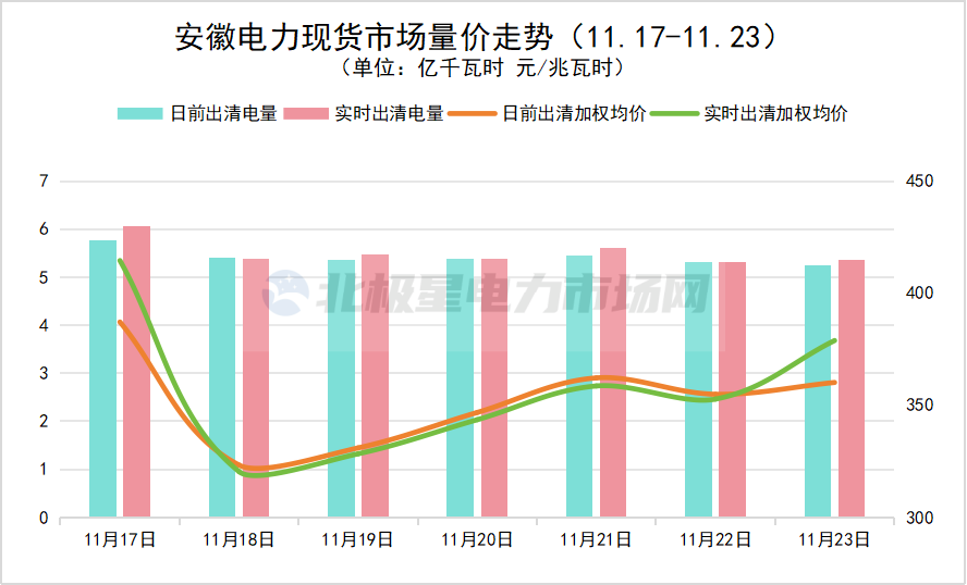 安徽:11月17日至11月23日日前出清加权均价最高为387.14元/兆瓦时,最低为323.34元/兆瓦时。实时出清加权均价最高为414.53厘/千瓦时,最低为320.43厘/千瓦时。