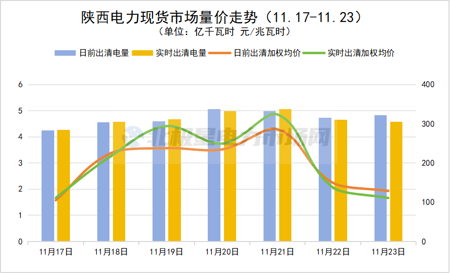陕西:11月17日至11月23日日前出清加权均价最高为285.88元/兆瓦时,最低为104.95元/兆瓦时;日前出清加权均价最高为323.39元/兆瓦时,最低为110.66元/兆瓦时。