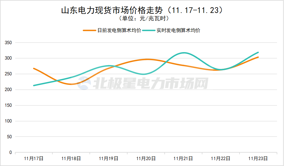 山东:11月17日至11月23日日前发电侧算术均价最高为303.34元/兆瓦时,最低217.06元/兆瓦时;实时发电侧算术均价最高318.54元/兆瓦时,最低212.91元/兆瓦时。