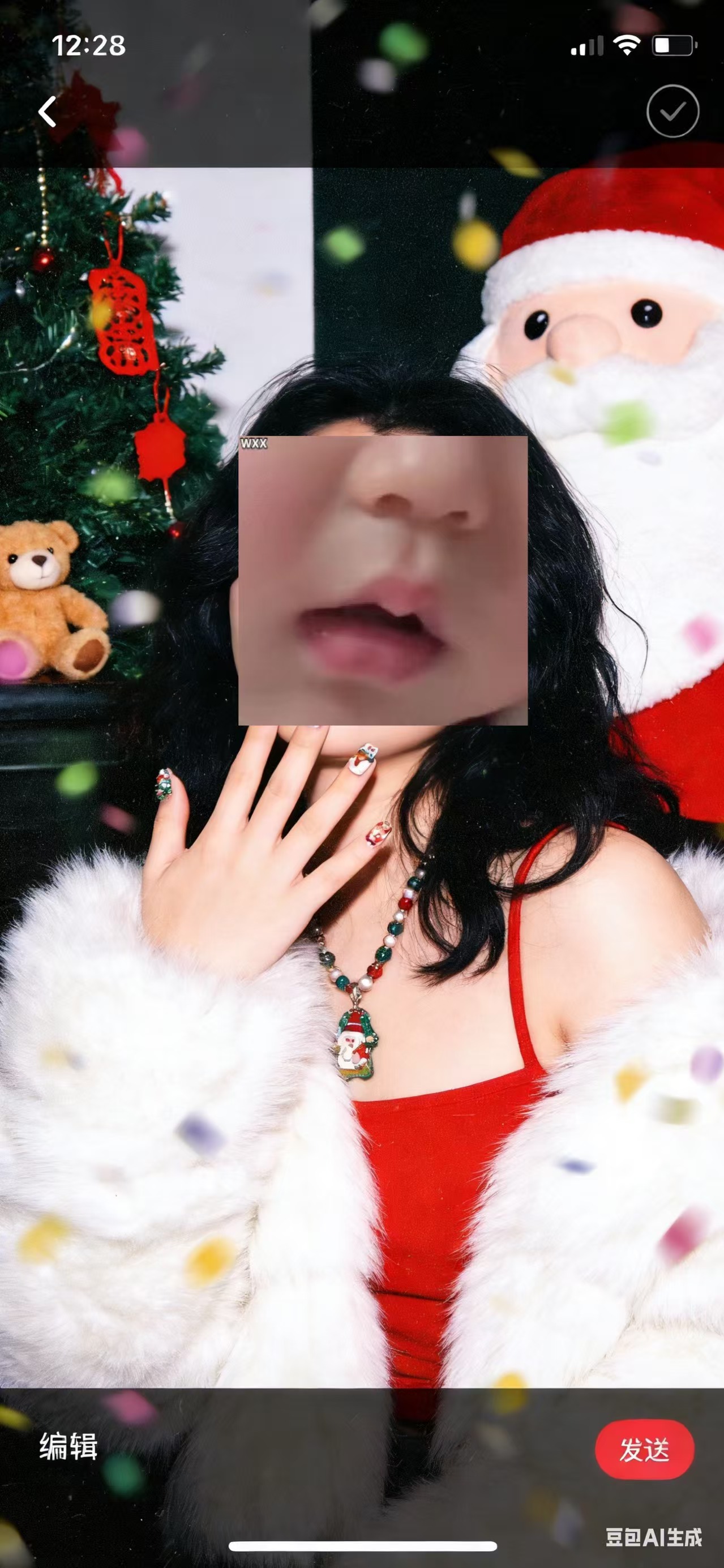 场景:整体为圣诞派对氛围场景,画面左侧有装饰着红色挂件的圣诞树,并放有一只小熊玩偶,画面右后方有一只巨大的圣诞老人毛绒玩偶,画面前景有彩色纸屑飘落,带有运动模糊效果。