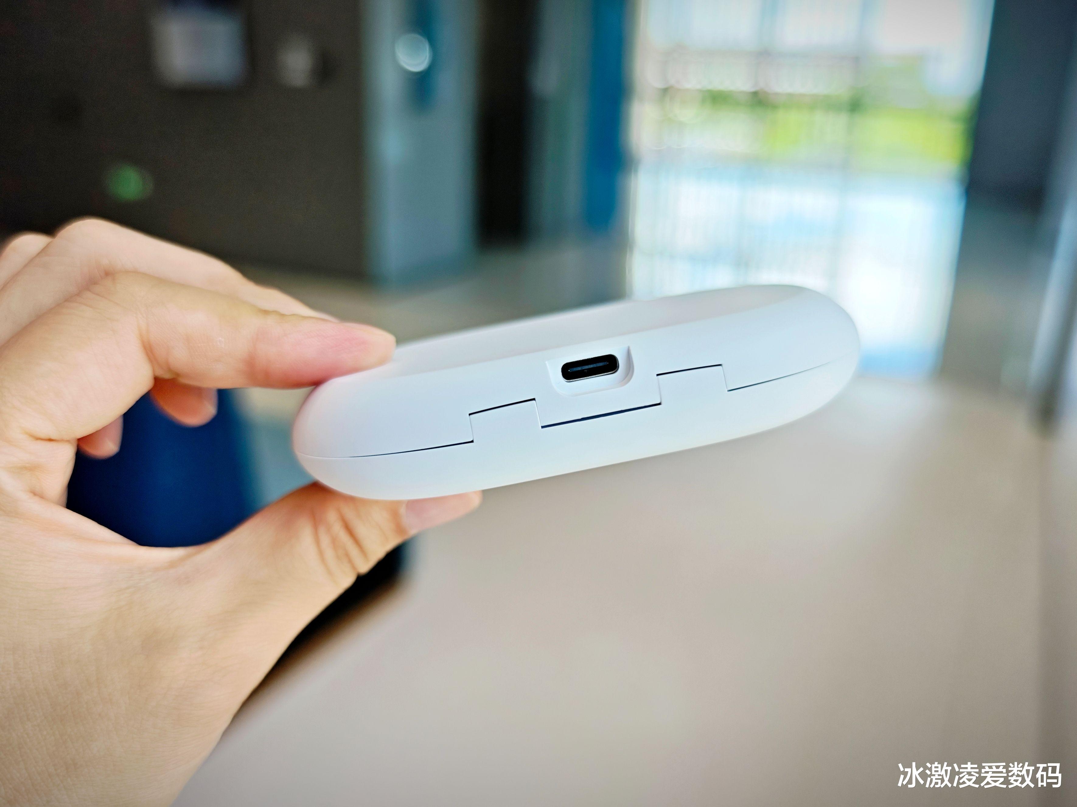 椭圆形的仓盒洁白柔润,虽然是长方体,但是四边没有棱角,握在手里像手握鹅卵石一样光滑,而且它很薄,揣在口袋里也是可以的。Type-C充电口隐藏在仓盒的背面。