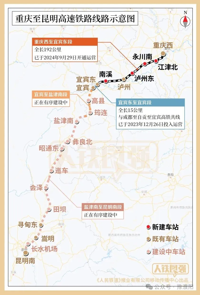 渝昆高铁渝宜段(重庆西至宜宾东段)全长192公里,已于2024年9月29日开通运营。设重庆西、江津北、永川南、泸州东、泸州、南溪、宜宾东等7个车站。另外,九龙坡为预留车站。