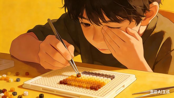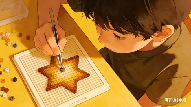拼豆的豆子非常小,通常直径只有2.6毫米到5毫米不等,而且颜色相近容易混淆。孩子在进行创作时,需要长时间、高度集中地盯着模板,用镊子一颗一颗地将豆子夹起并放入指定的位置。